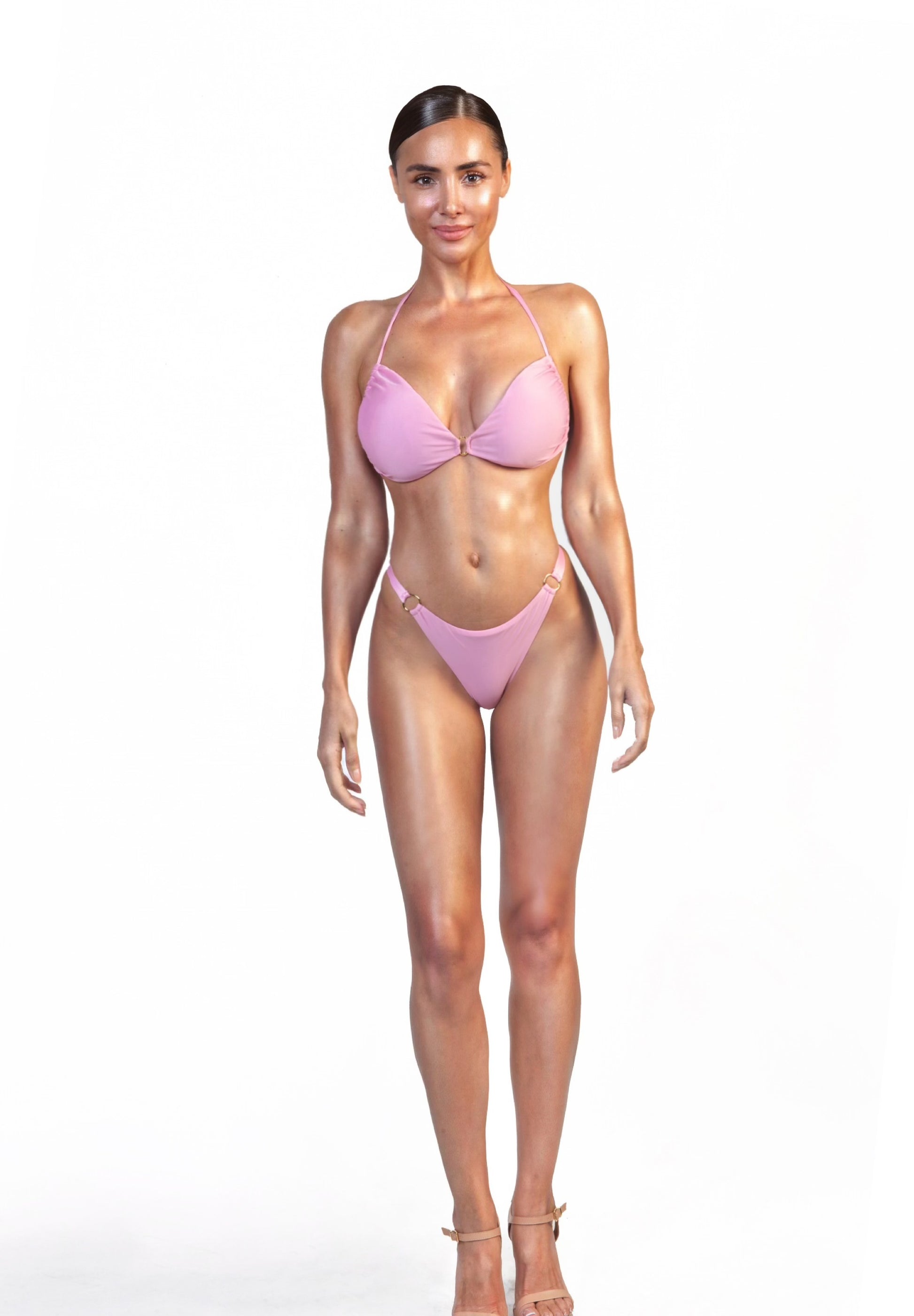 The bottom with seamless wide sides provides a smooth fit that doesn’t dig in, while the double Brazilian-style back flatters the curves with elegance and sensuality. Perfect for those who love luxury beachwear with a soft, effortless glow.