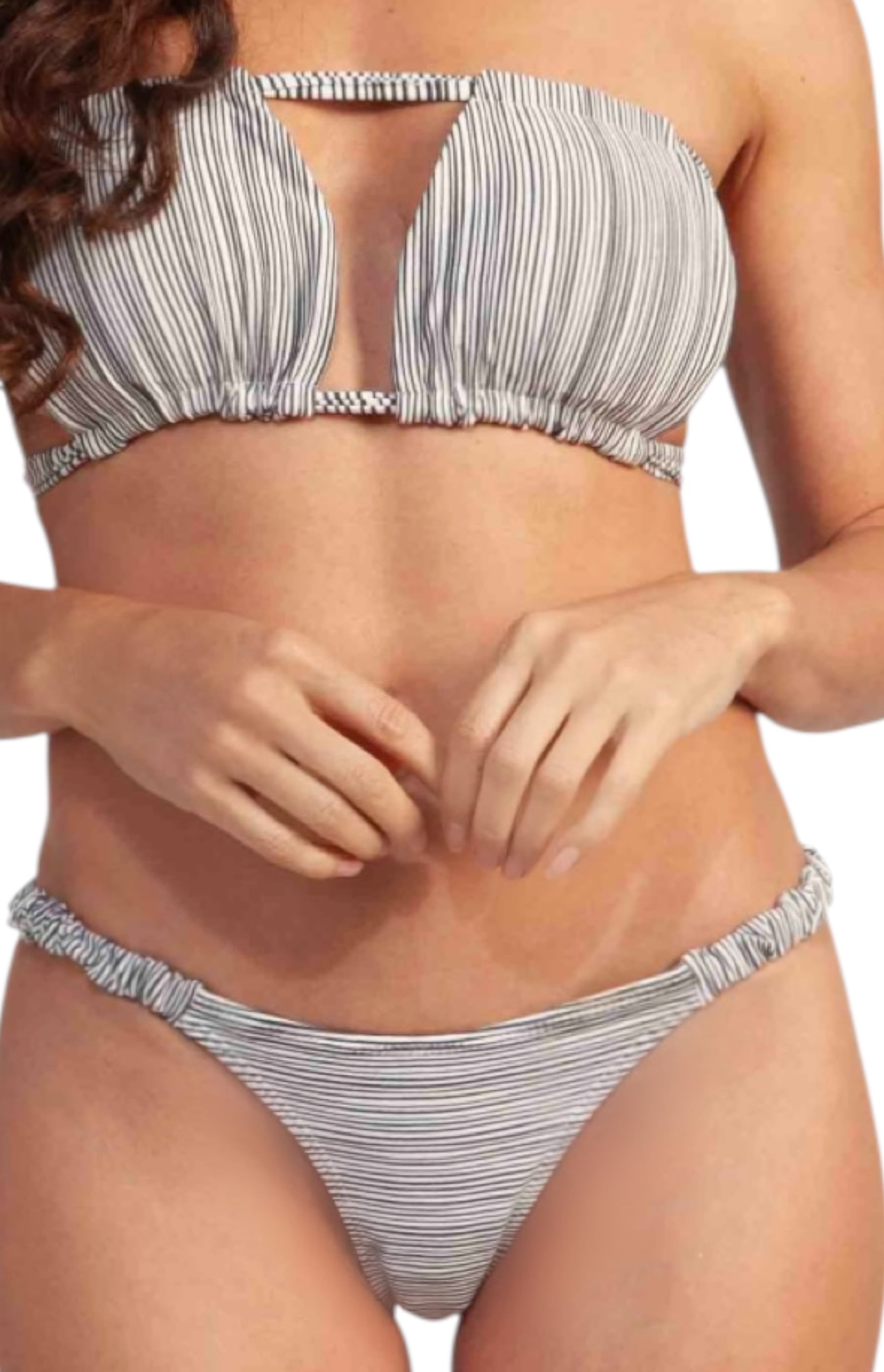The ruched side bottom with classic back coverage enhances curves, providing absolute comfort and elegant fit. Every detail of this set is designed to ensure freedom of movement, flawless fit, and refined style, making the Stripes bikini ideal for exclusive beaches, sophisticated pools, and luxurious summer moments.