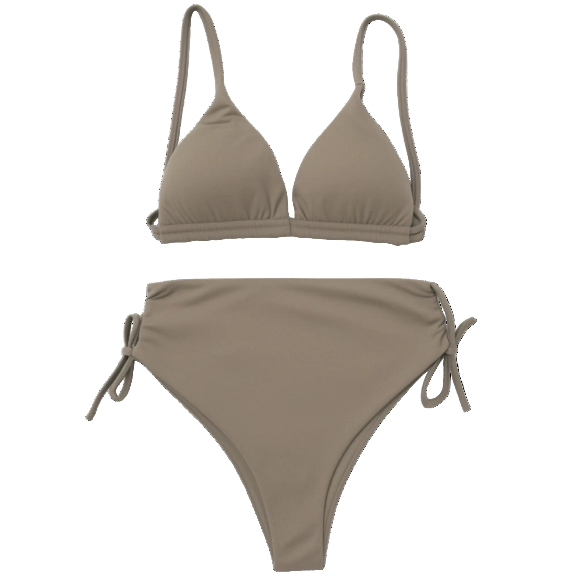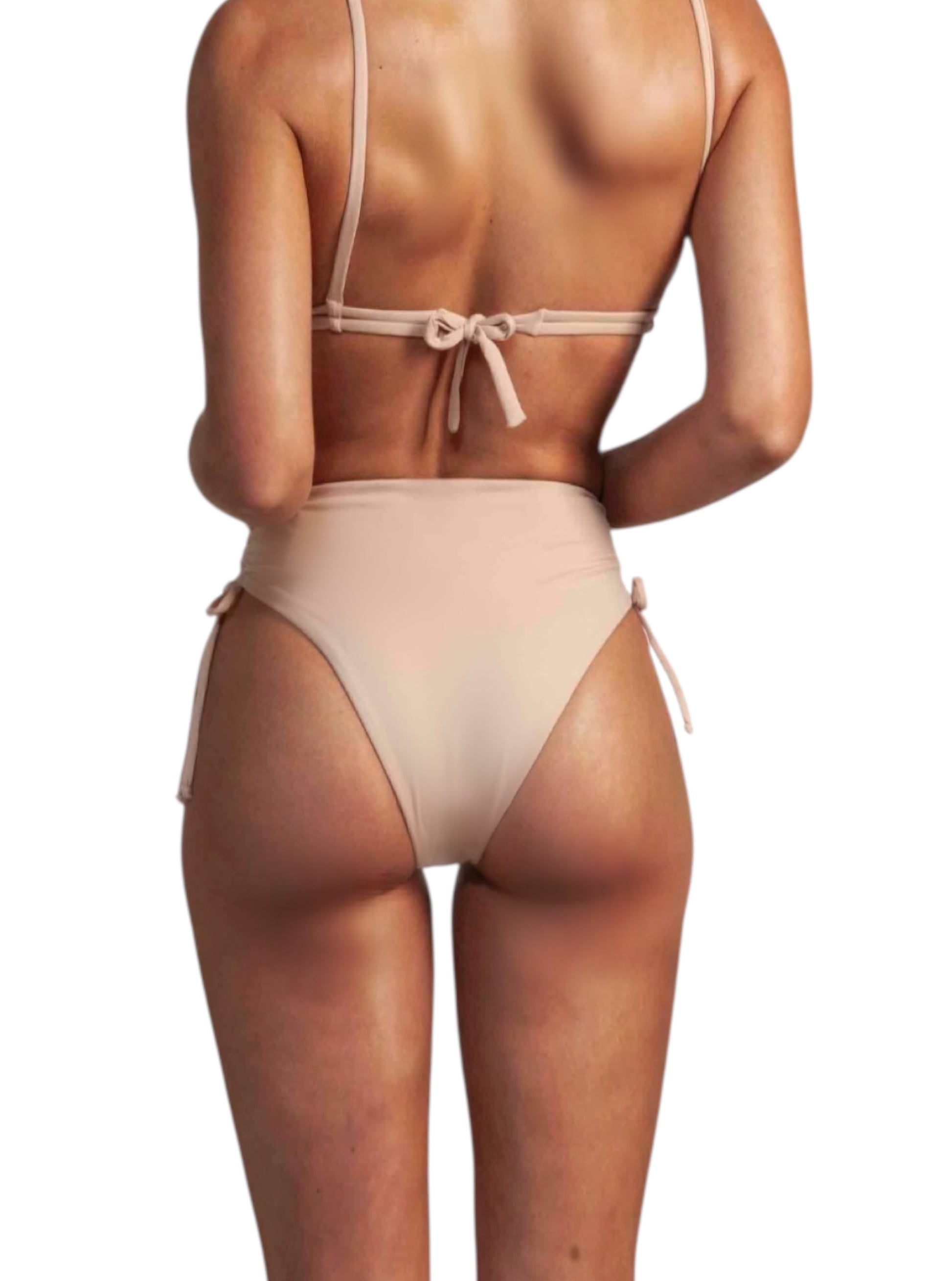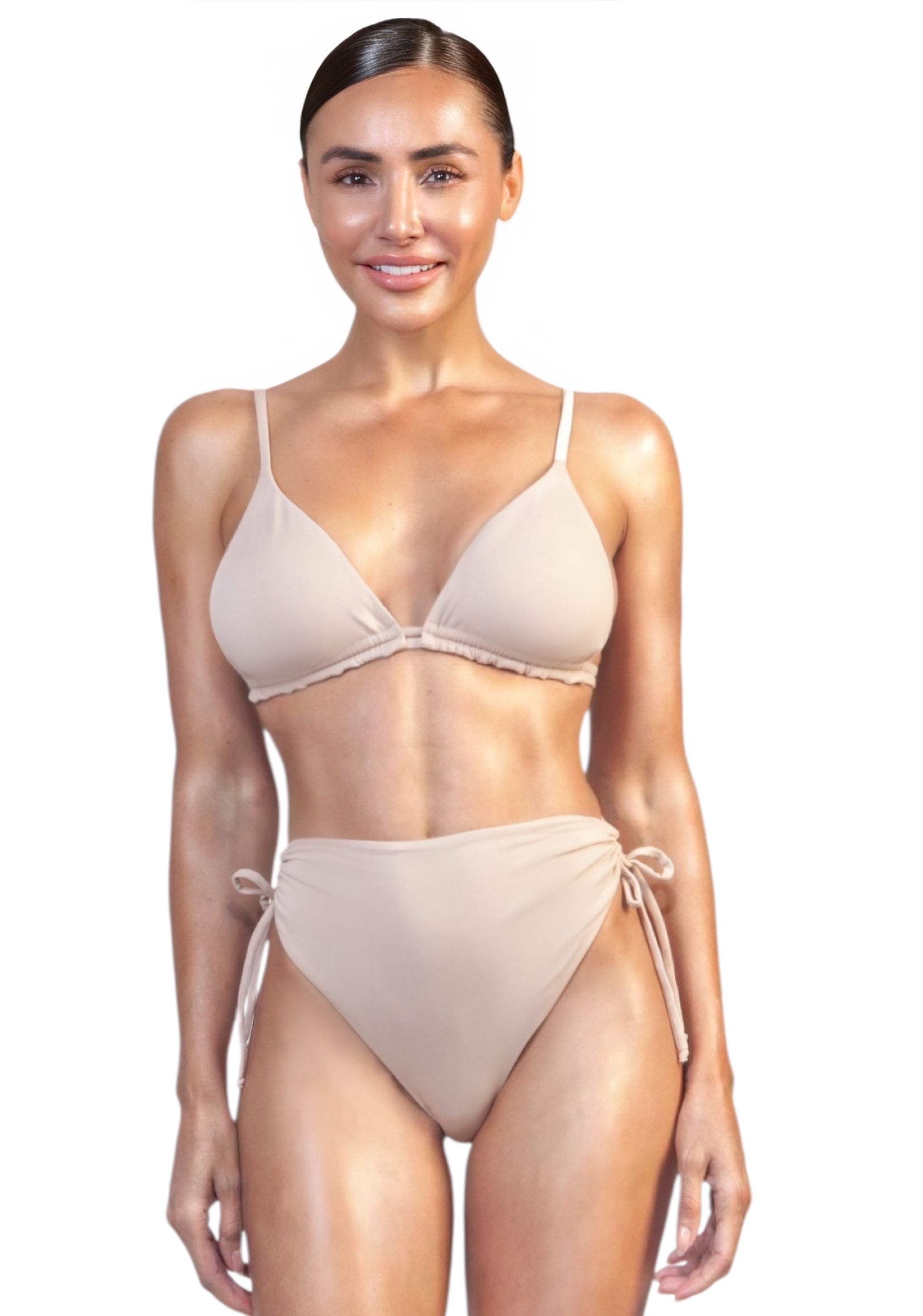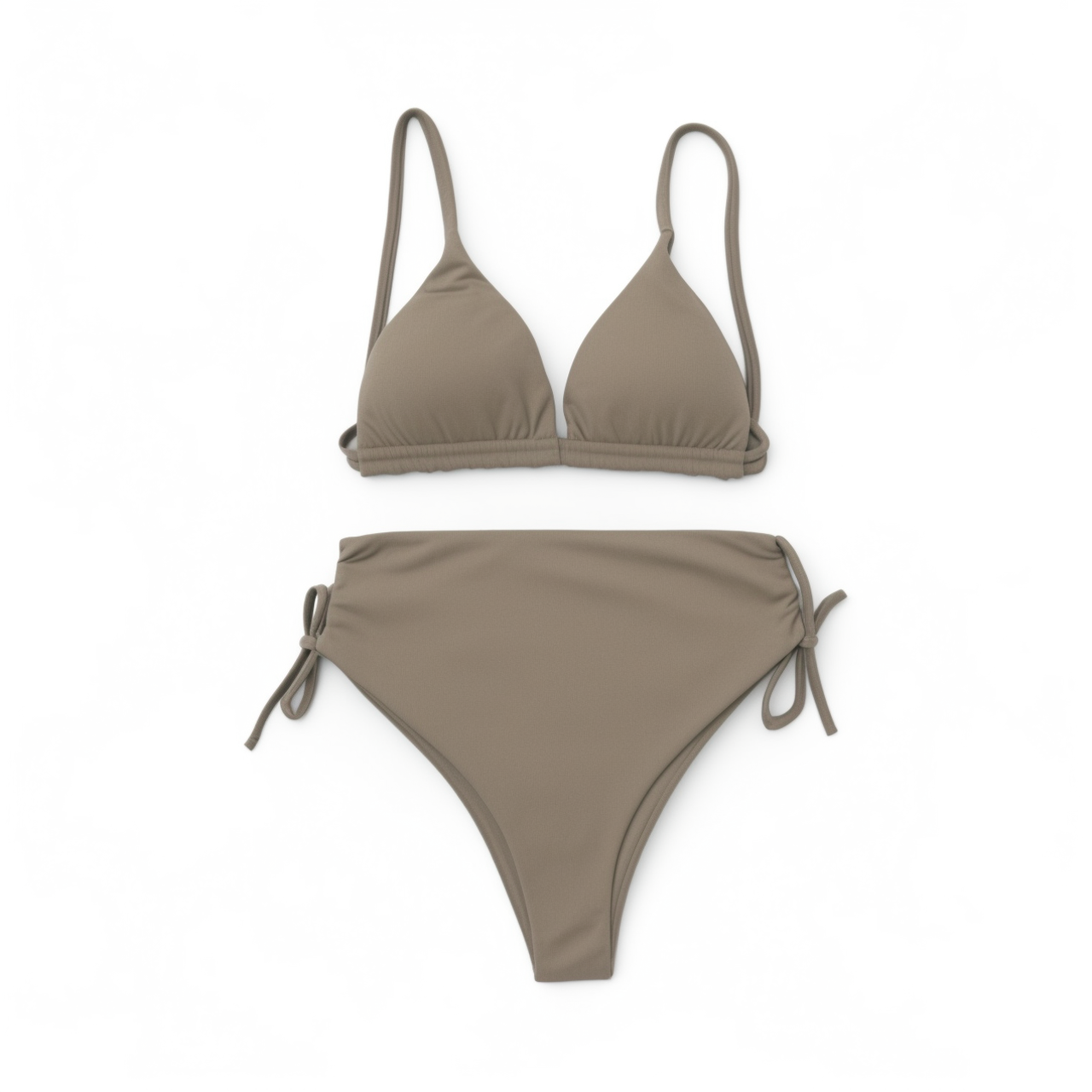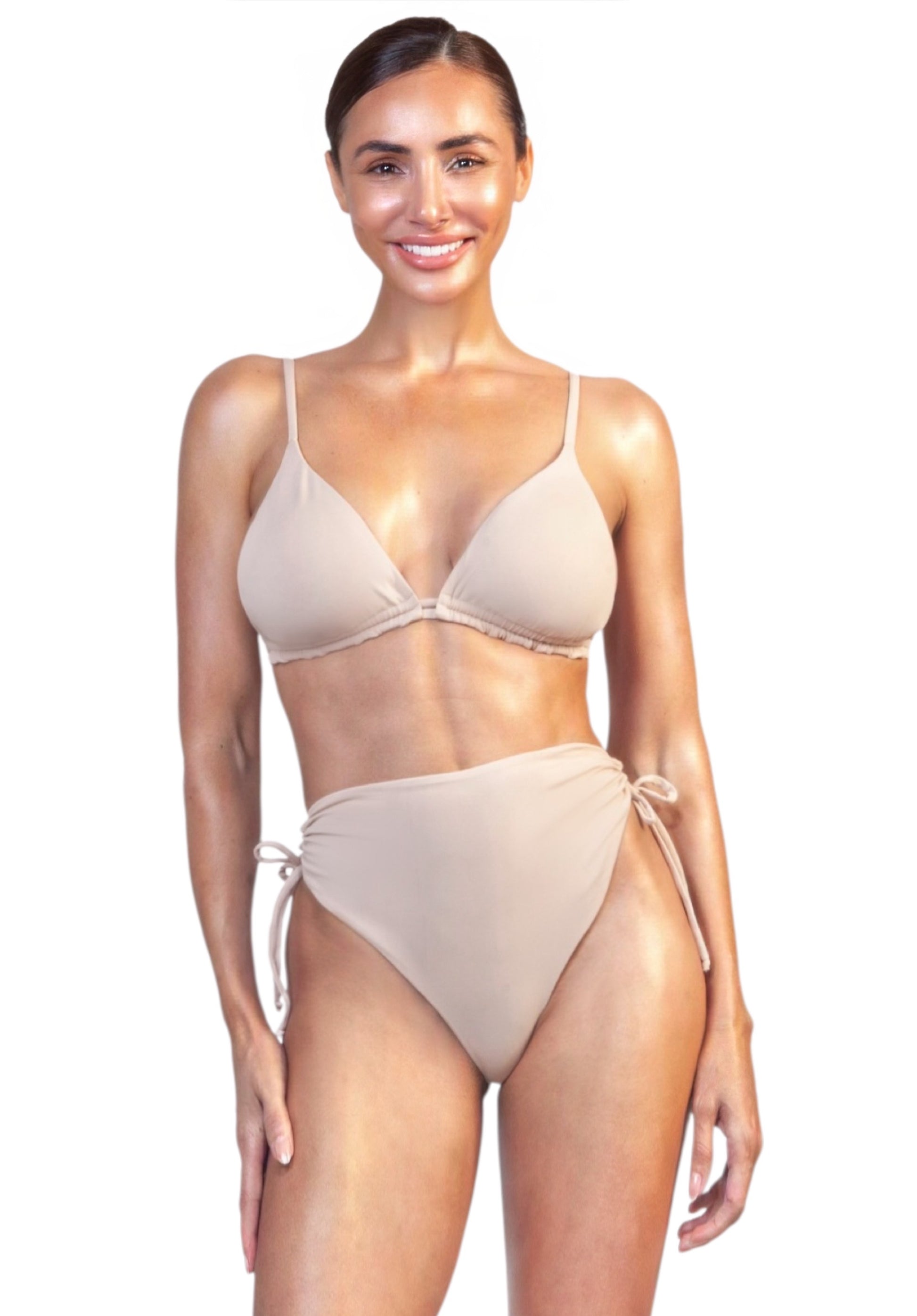 The Puncake bikini is perfect for those seeking style, sensuality, and sophistication. The triangle top with shoulder straps offers a delicate drape and a customizable fit, while the removable padding ensures comfort and versatility. The double tie straps under the bust add a modern and sensual detail that enhances the silhouette.