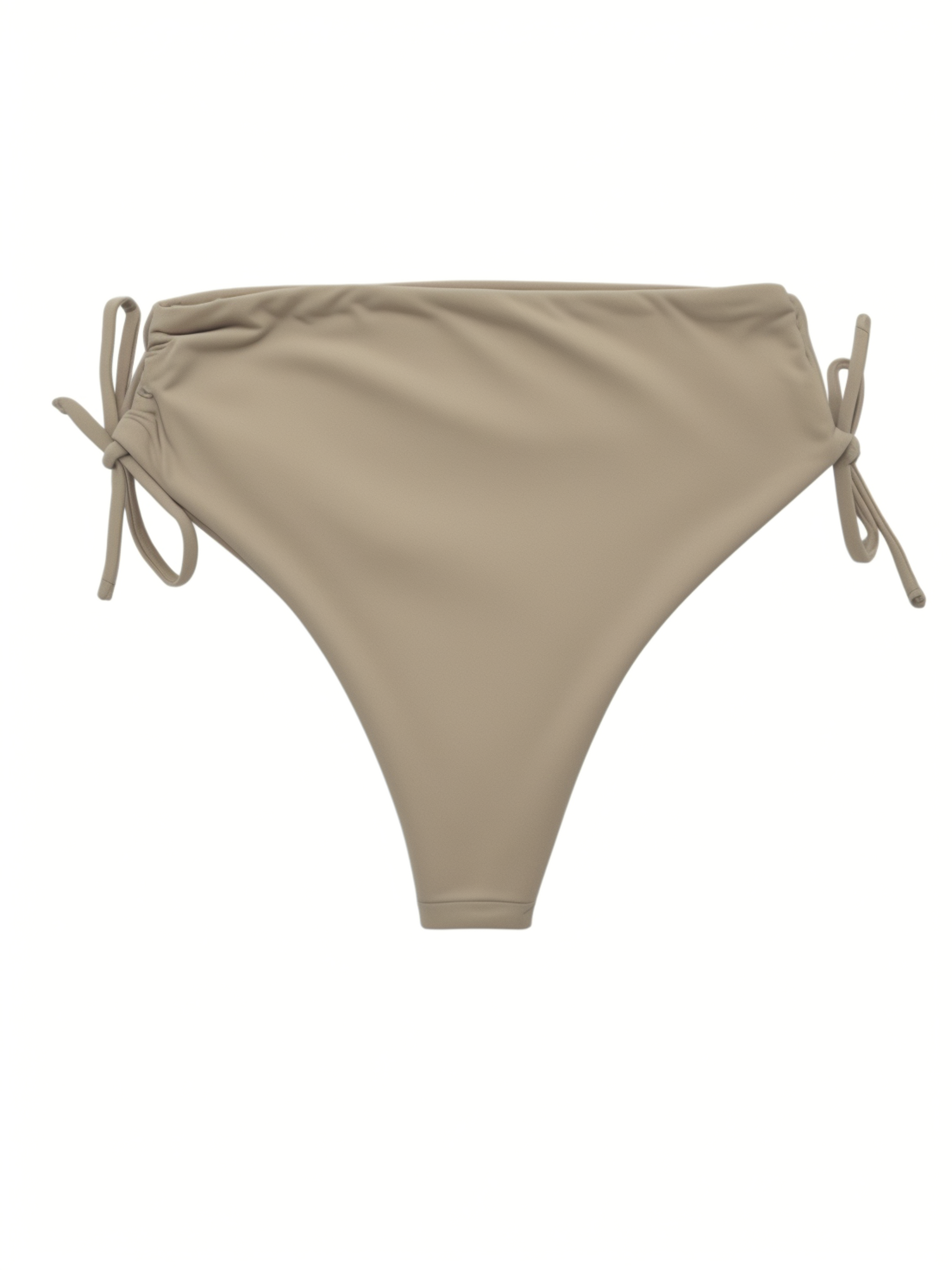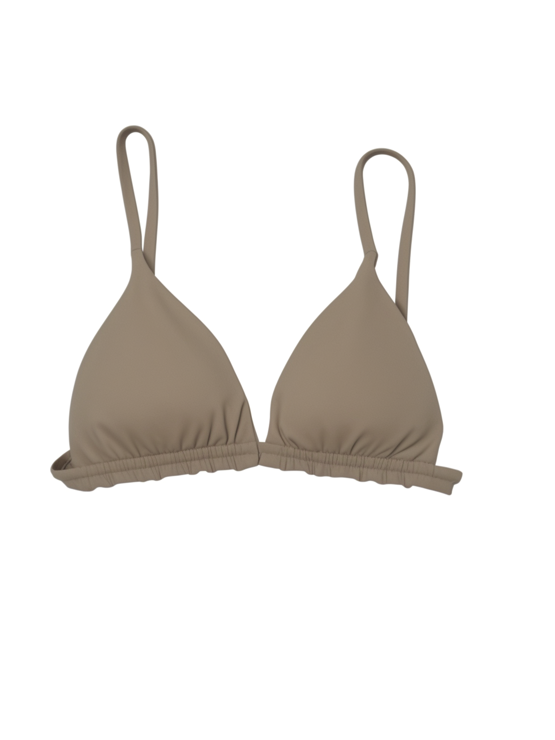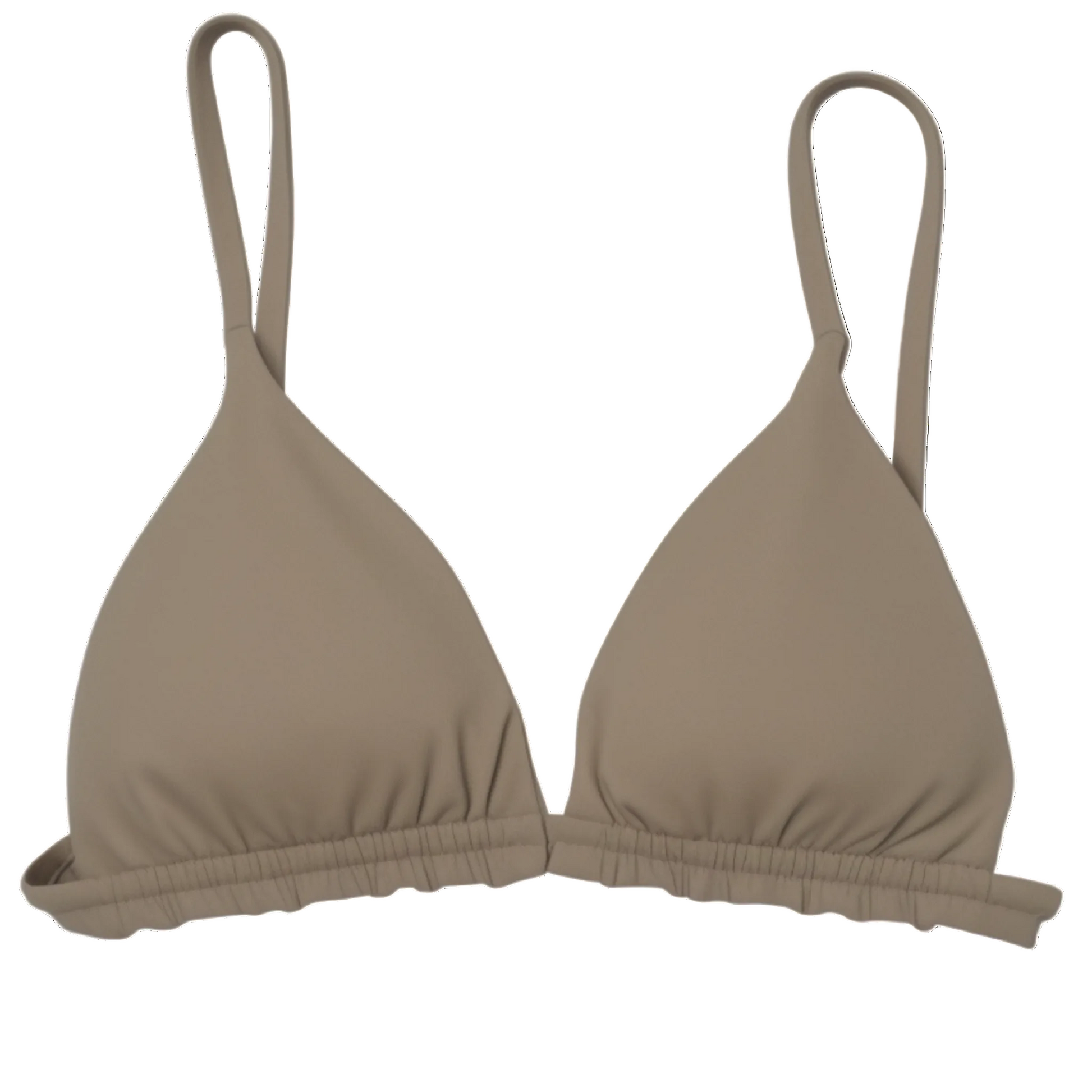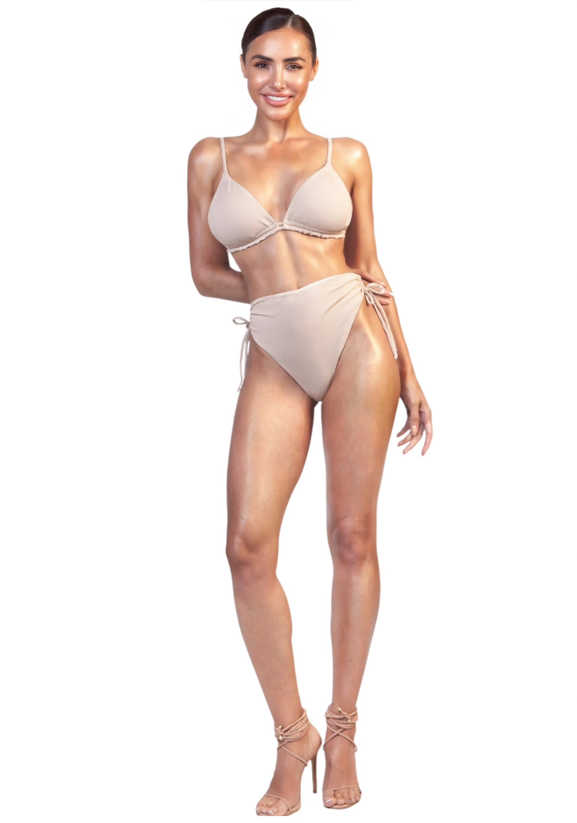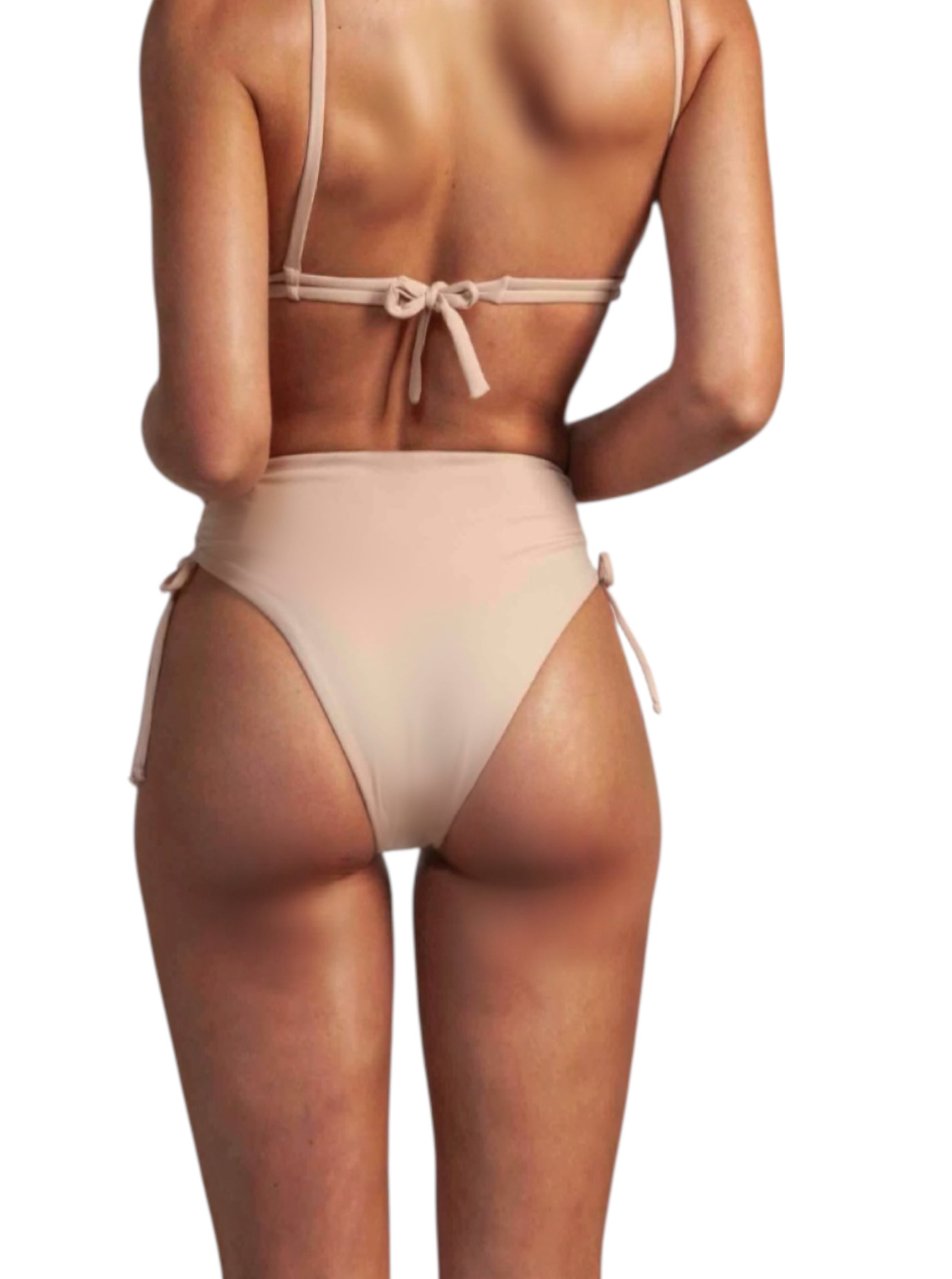 The Puncake bikini is perfect for those seeking style, sensuality, and sophistication. The triangle top with shoulder straps offers a delicate drape and a customizable fit, while the removable padding ensures comfort and versatility. The double tie straps under the bust add a modern and sensual detail that enhances the silhouette.
